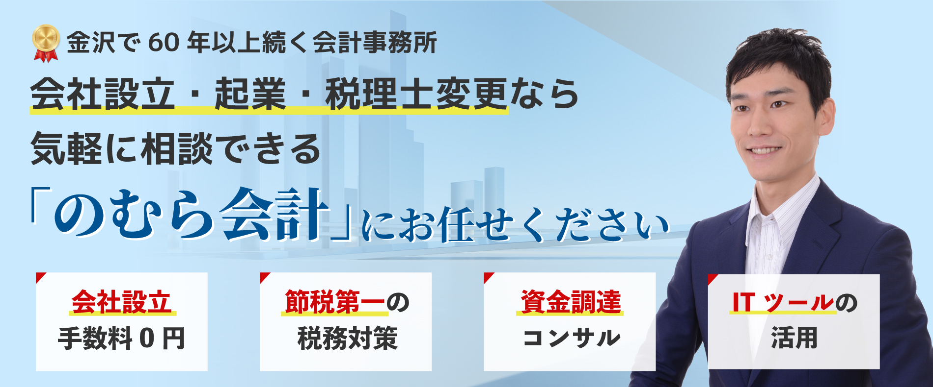 はじめまして。石川県金沢市で会社設立・起業支援に特化したサービスを提供する「税理士法人 のむら会計」代表の野村 篤史(のむら あつし)と申します。 弊所は、金沢市で 50年以上続く会計事務所として、地元企業・個人事業主の皆様のご支援をして参りましたが、皆様から多く寄せられるお悩みとして…